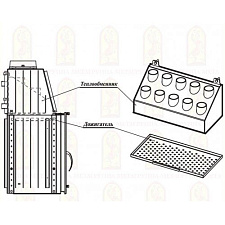 Пламегаситель выполнен из вермикулита. Дымосборник из стали толщиной 4 мм дополнительно защищен пластиной из нержавеющей стали в лобовой части. Для подсоединения к дымоходу используется чугунный патрубок.