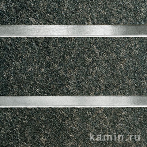 Каминная облицовка из черного гранита с горизонтальными вставками из матовой нержавеющей стали, возможна сокращенная версия.